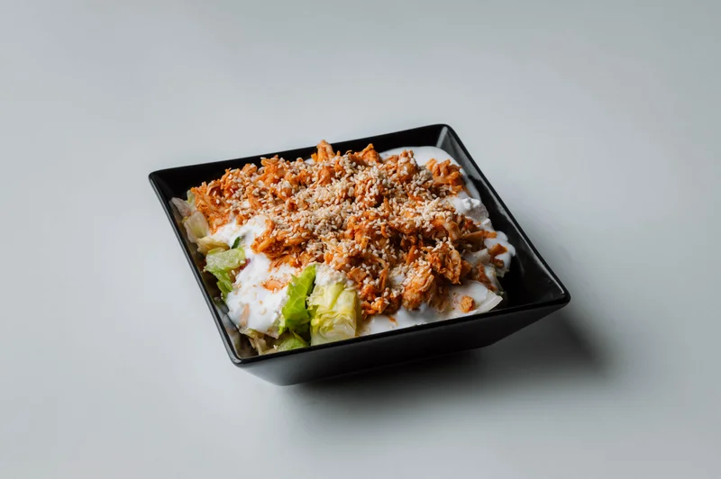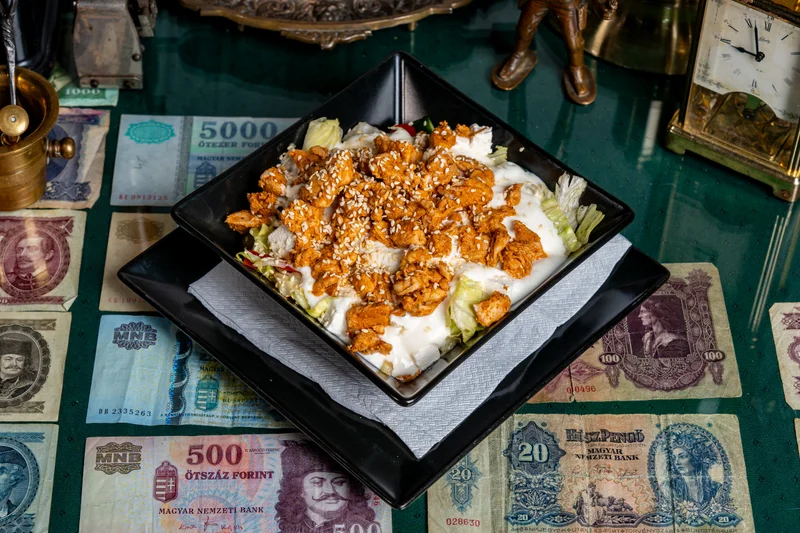 friss jégsaláta, paprika, paradicsom, uborka, szezámmagos natúr csirkecsíkok, feta sajt, választható öntet