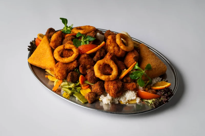 Rántott gomba, Rántott karfiol, Rántott sajt, Rántott hagymakarika, Kukoricás rizs, Párolt zöldségek, Hasábburgonya